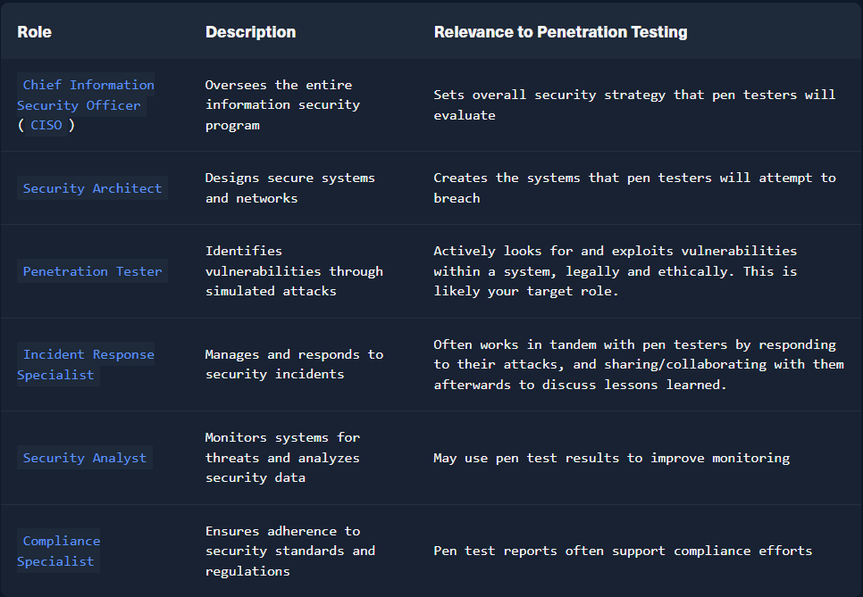 I have included a table from HackTheBox that outlines different roles, their description, and relevance to penetration testing below.
